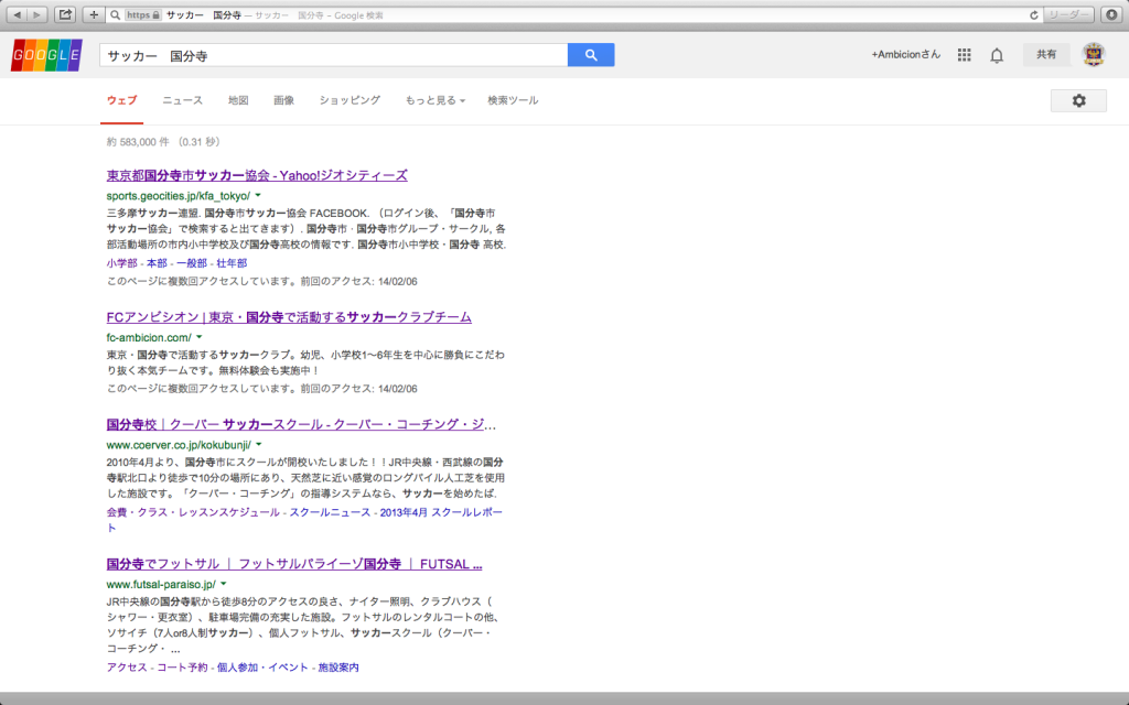 2014年2月7日 おぉ!! カテゴリ :監督の呟き タグ :所感 投稿者 :木藤 大輔 Tweet すごいです!! Googleで「サッカー 国分寺」と検索してみたら、なんと 我らがFCアンビシオンの検索結果が急上昇しているではないか!! つい最近まで14〜15番目(2ページ目)だったので驚きです。 ここまできたか〜。 これからもどんどんチェックしてくださいね!! ※前回に引き続きHPネタですんません(笑) Kido Daisuke 関連 スポンサードリンク